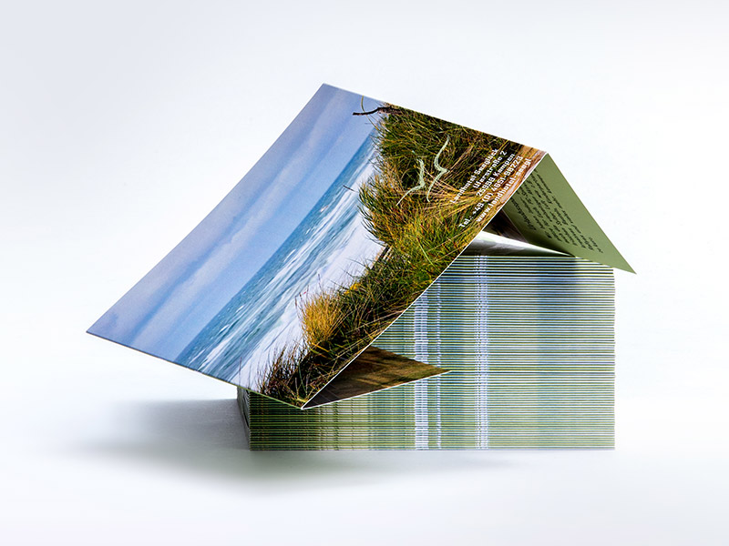 Großes Potenzial liegt in der Falzart: viel Werbefläche und platzsparende Lagerung. In Klein- und Großauflagen.