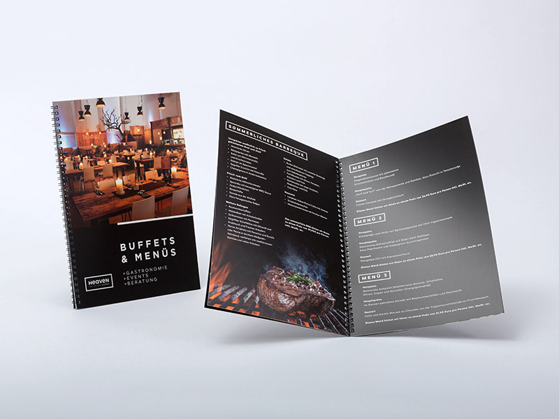 Bei viaprinto finden Sie sechs Varianten im Angebot. Die Klammerheftung, Spiralbindung, Menükarte plano, als Wickel- oder Einbruchfalz und auch die passenden Einlegeblätter. Mit bis zu 14 Formaten haben Sie eine breite Auswahl, um Speisekarten erstellen und drucken zu lassen.